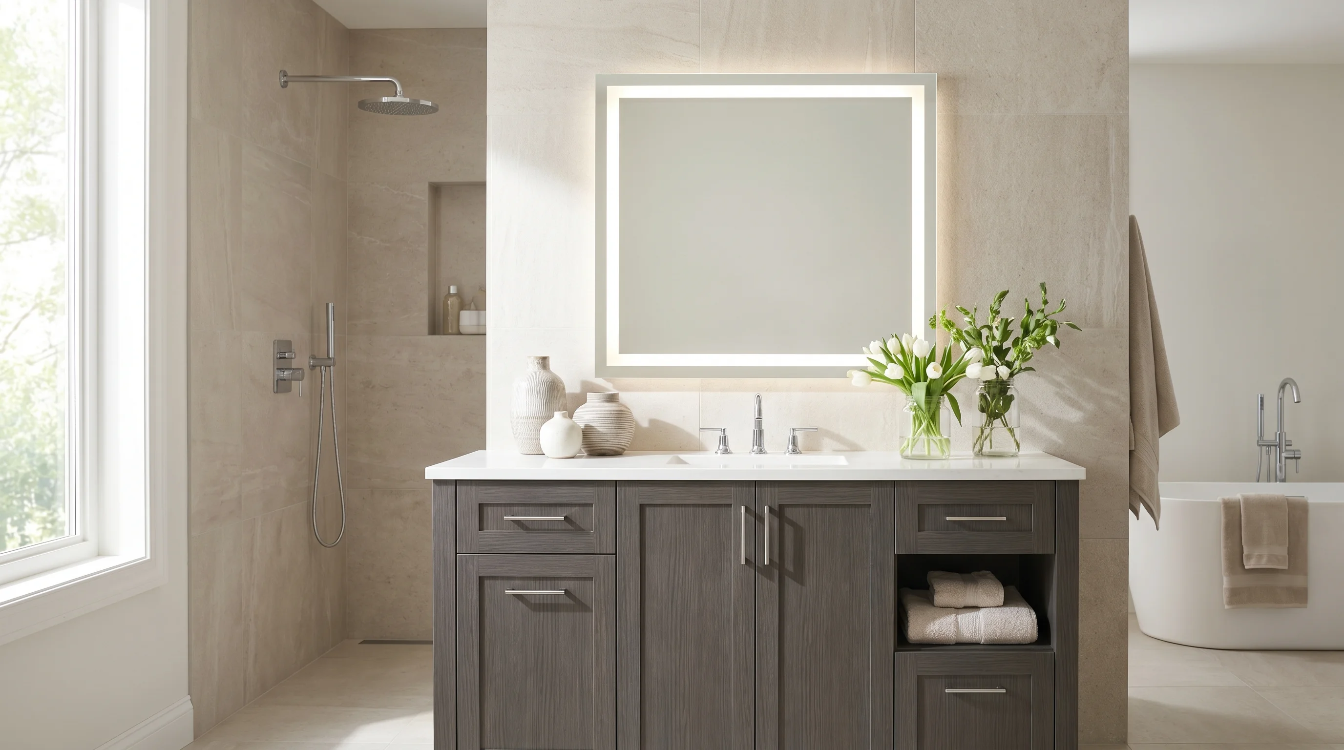 But grey is worth serious consideration, especially in bathrooms with a window or strong overhead lighting. A grey vanity grounds the room and pairs naturally with large-format porcelain tile in a light concrete or greige tone. Use white grout lines to keep it from going too dark. The contrast between the grey cabinet and a bright quartz countertop actually helps define the vanity as a design feature rather than just a utility piece.